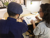 まずは希望のデザインの下絵を作成し、トレーシングペーパーに書き写します。さらに、トレーシングペーパーから消しゴム板に転写したら、デザインナイフの使い方の練習です。うまく彫るには、深さがポイント。練習後は、いよいよ本番の消しゴム板! 左右からナイフを斜めに入れ谷を作り、抜くようにして彫っていきます。ナイフよりも消しゴム板を回して彫ると良いそうです。